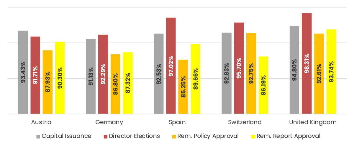 These patterns reflect both the maturity of Spain’s governance framework and the effectiveness of company engagement strategies in navigating shareholder concerns.