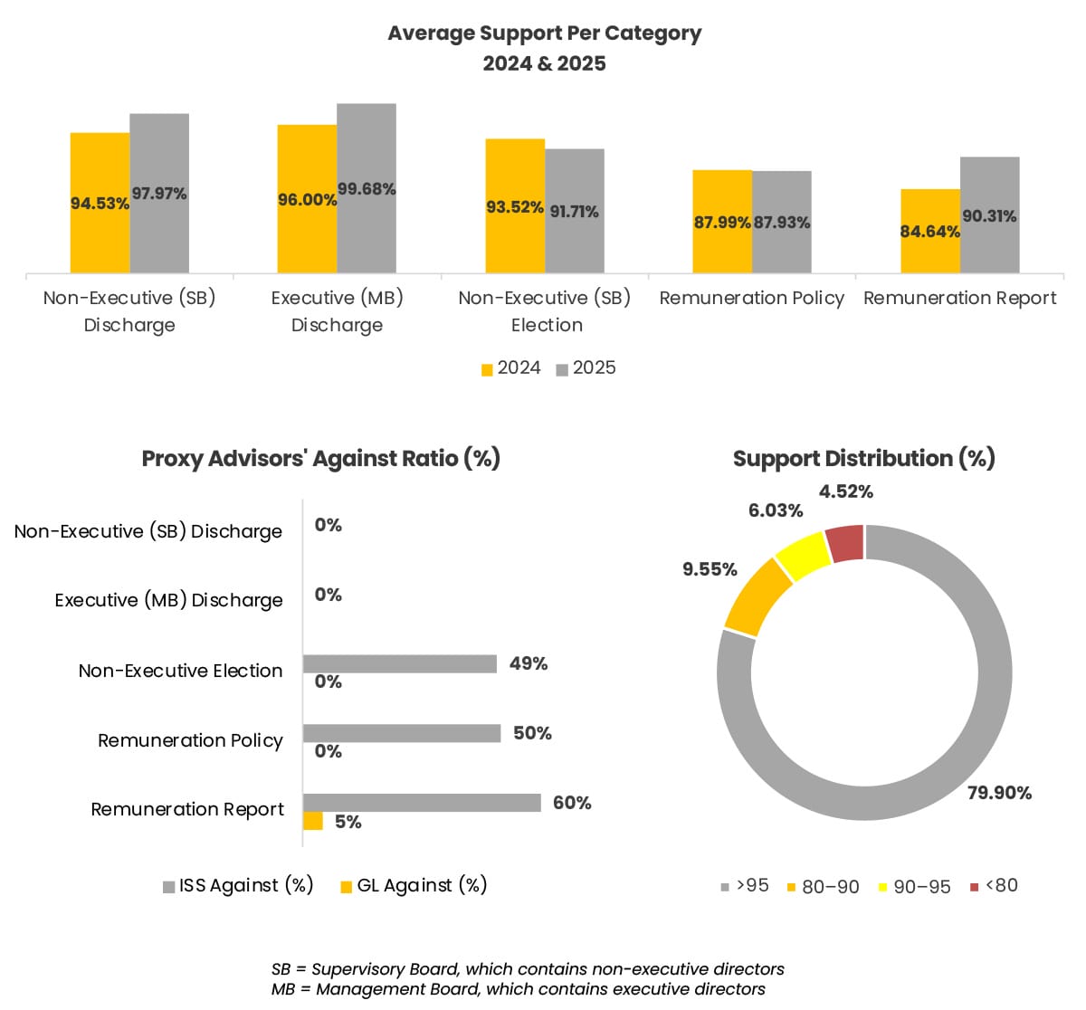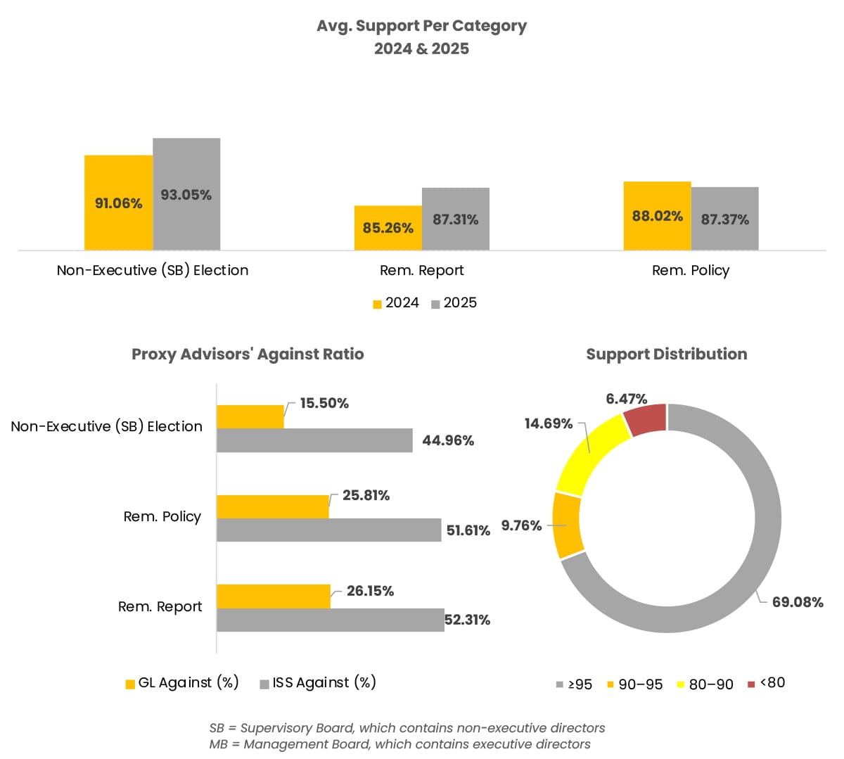 The Remuneration Policies, however, present a different picture. 32% of the 19 Systems received a negative ISS-recommendation, whilst the average support was at 89% and the lowest support at 56.7%. Interestingly, in 2024 only 17% of the 12 Policies received a negative recommendation, yet the average support level was nearly identical to 2025, at 89%. The lowest support in 2024 was even less at 40.4%.