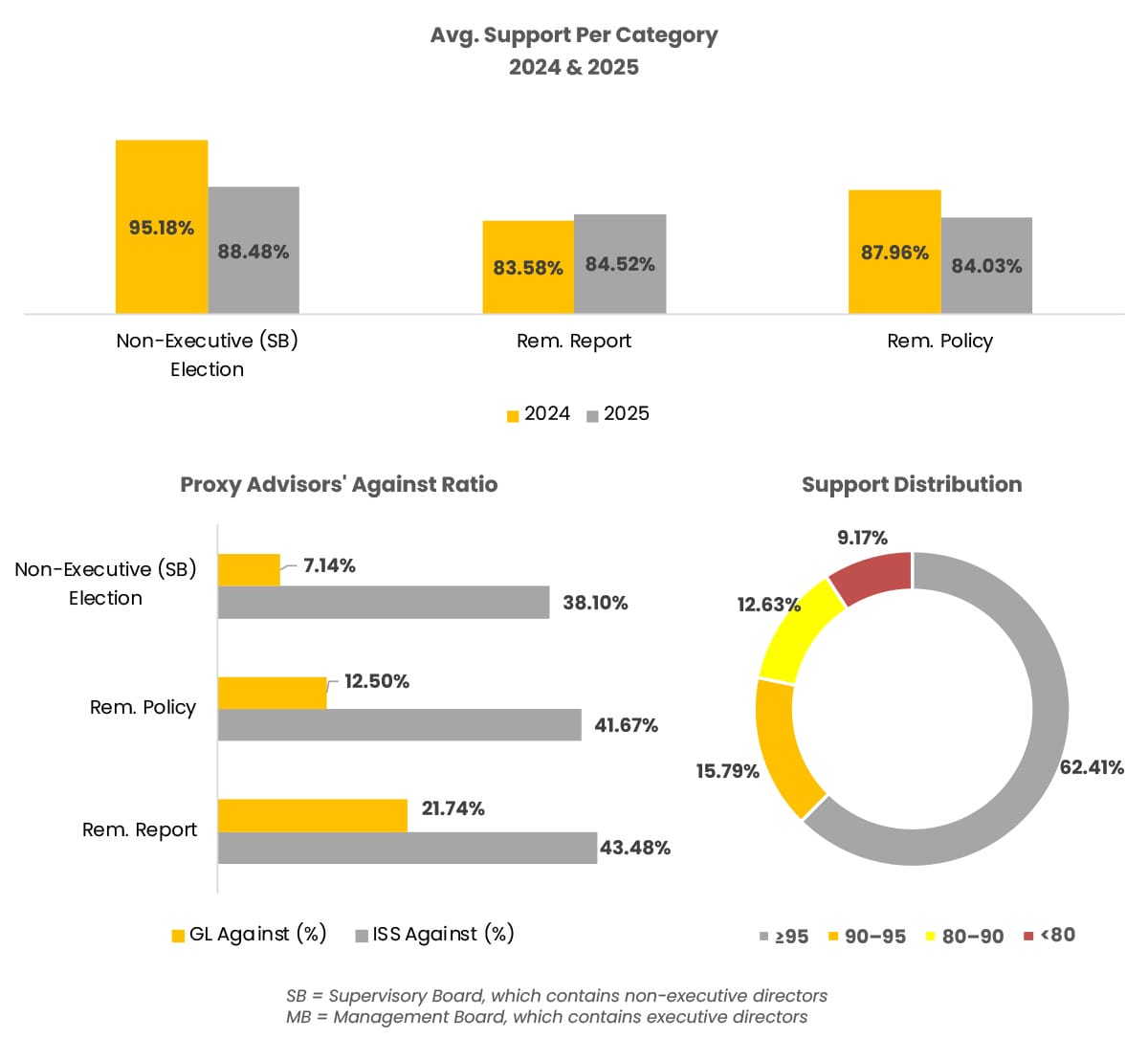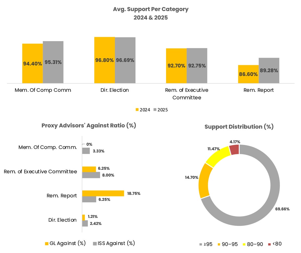 The Remuneration Reports stays low in ISS-against ratios, with only 8% in 2025 of 36 Reports, in line with 2024 where ISS was against 9% out of 35 different Reports.