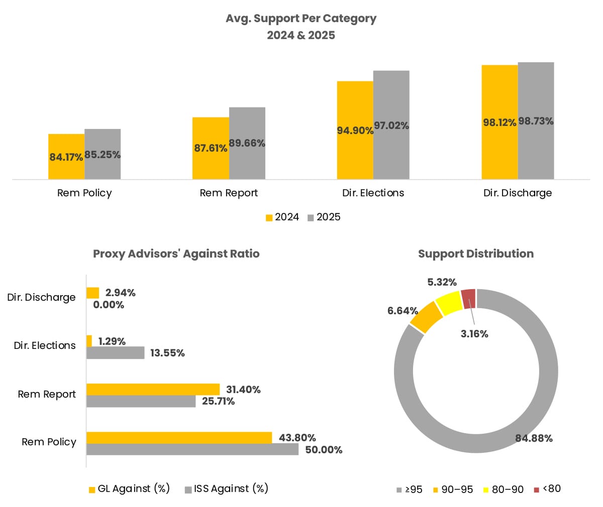 • In 2025, average support for the approval of the remuneration report grew by 2.68% compared to 2024. All items received above 50% support in 2025.